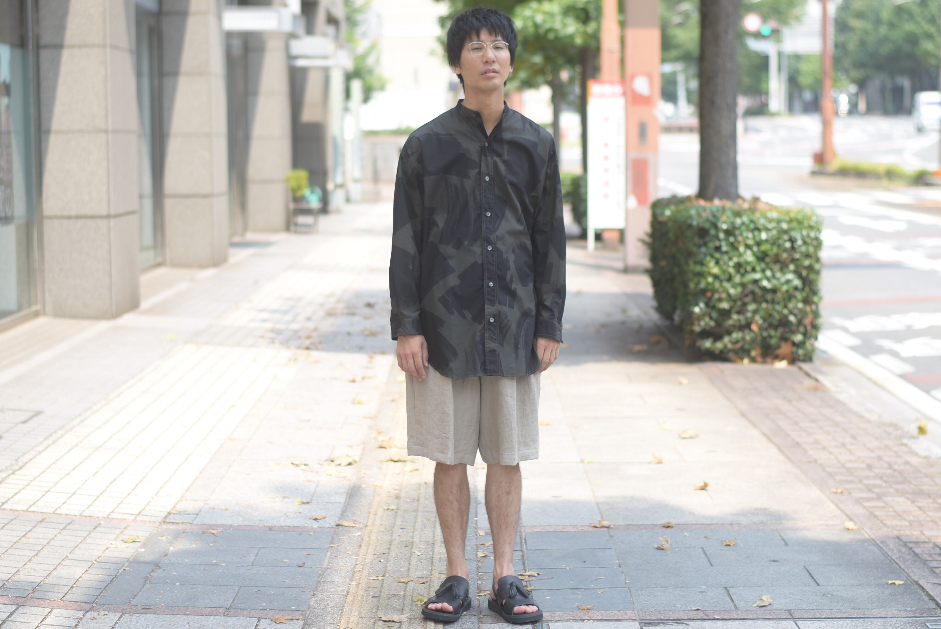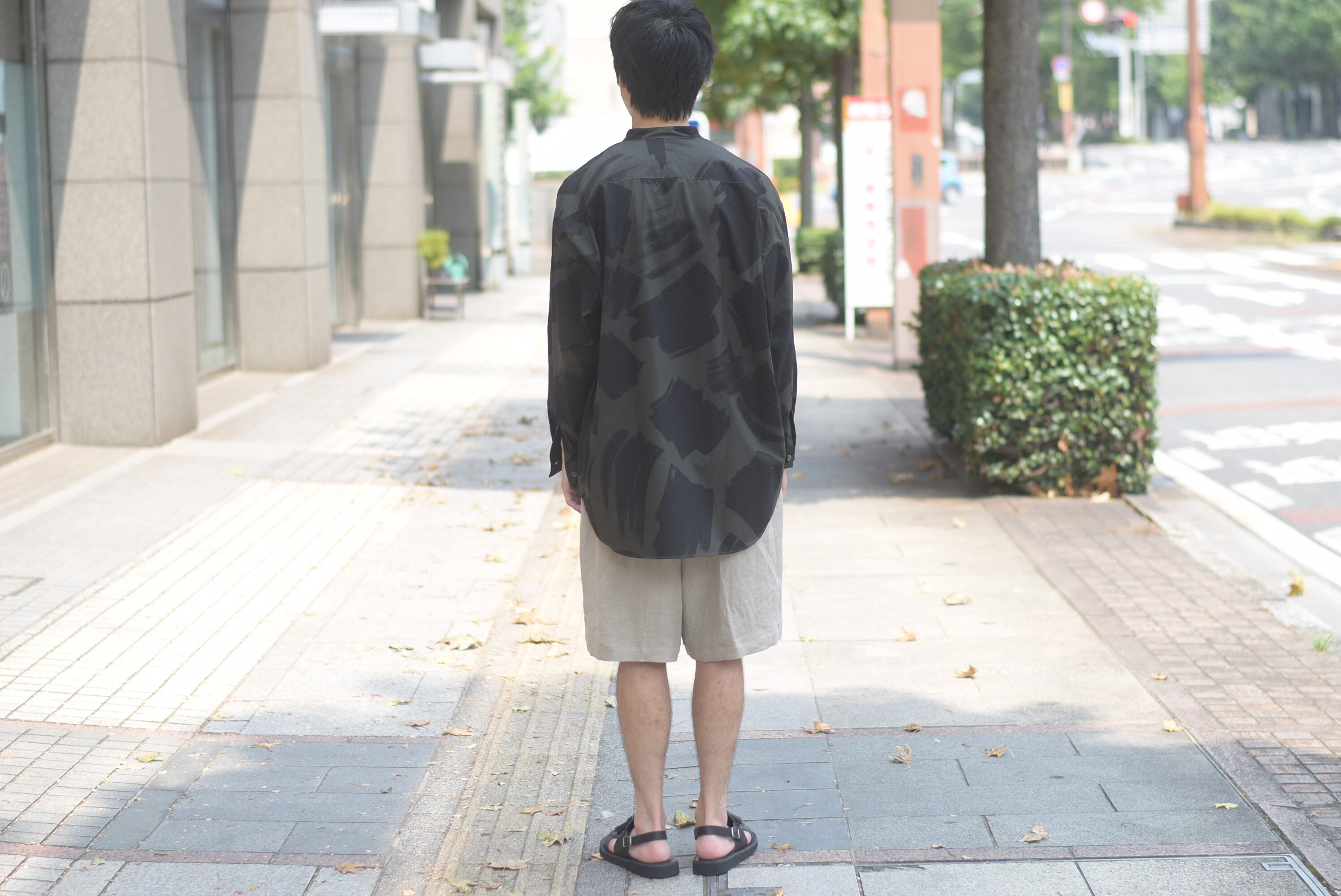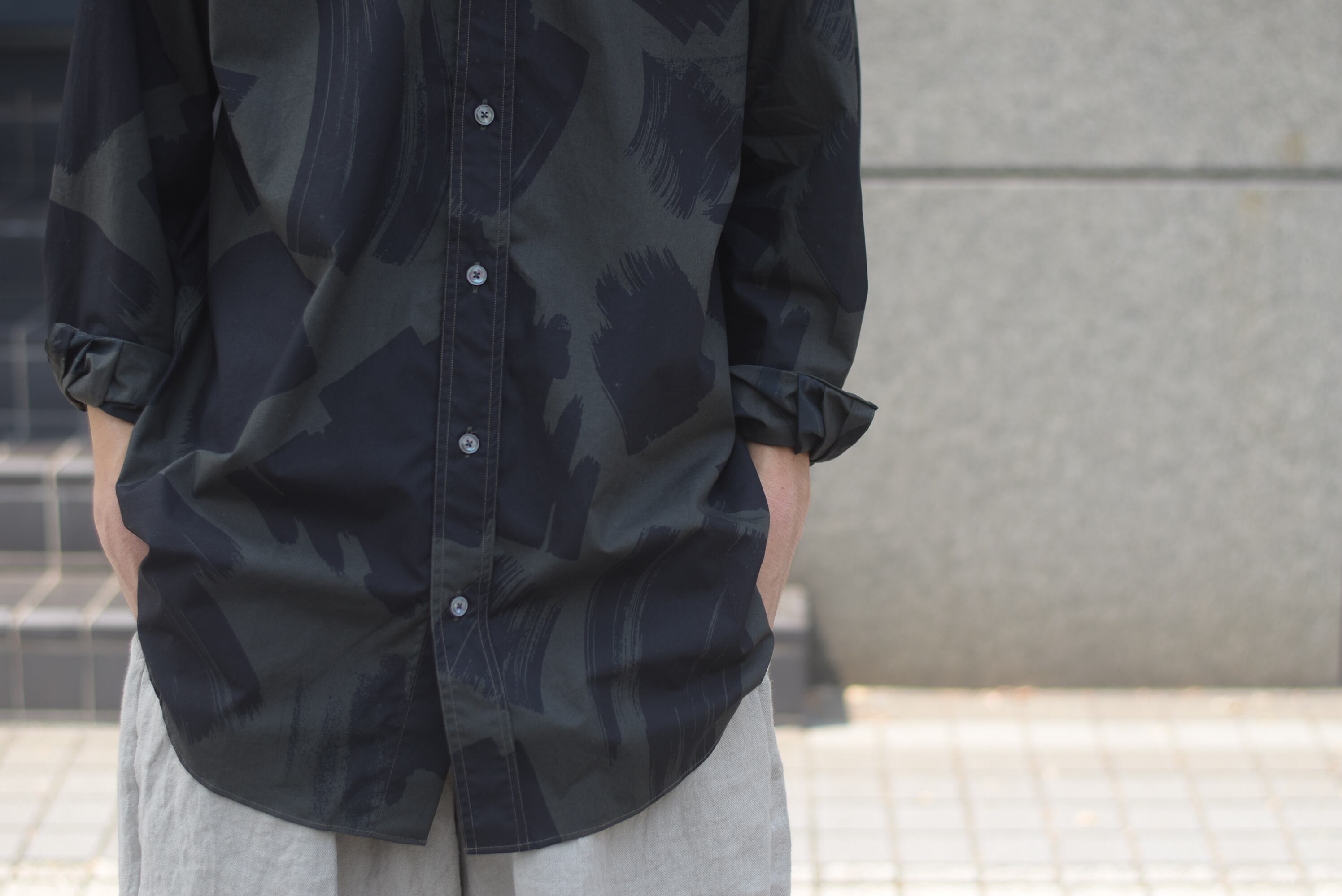 この、ミリタリー感強めのカーキ色ベースにブラックのブラッシュプリント…