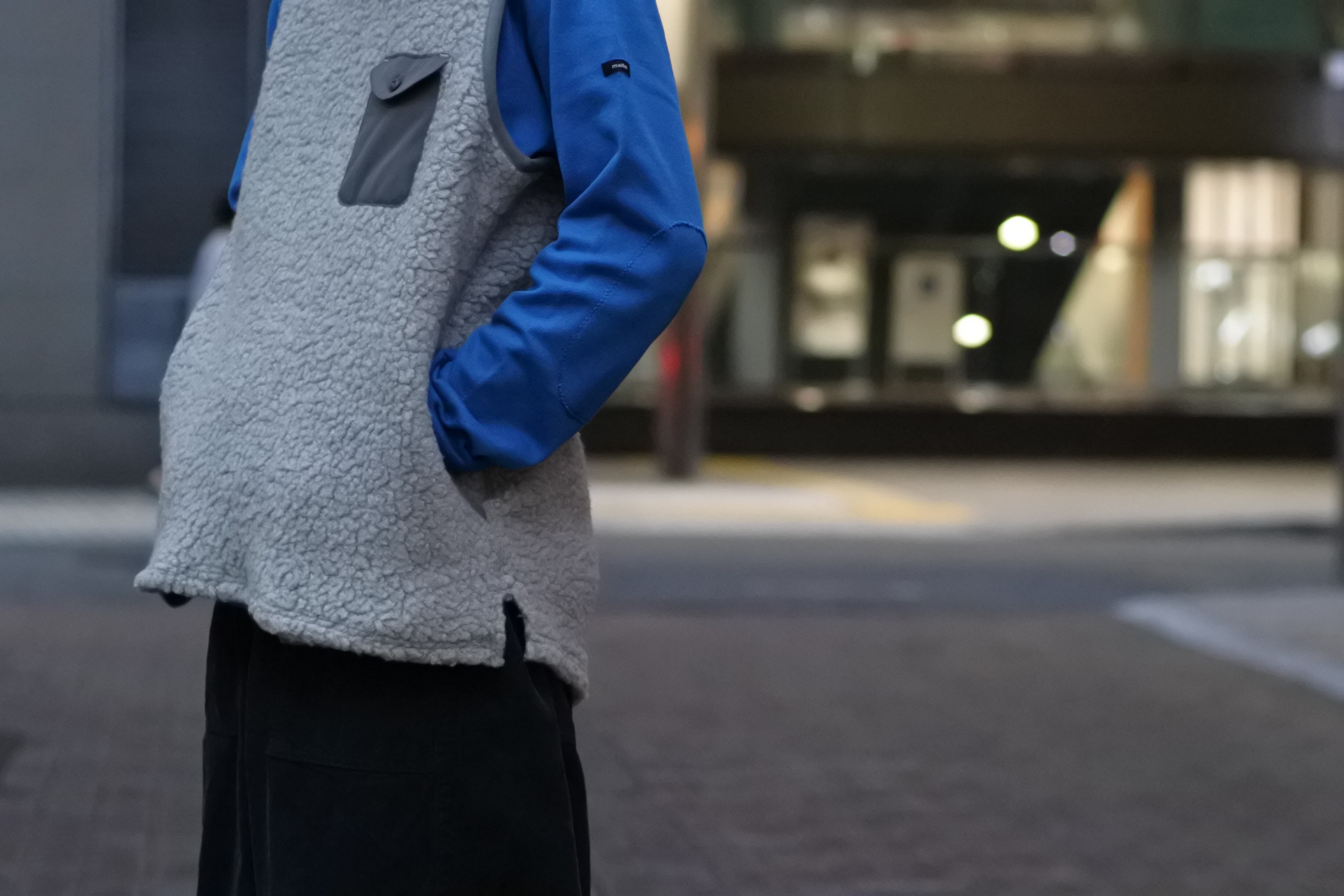 柔らかくもこもこした風合いが特徴の1枚仕立てのベスト。