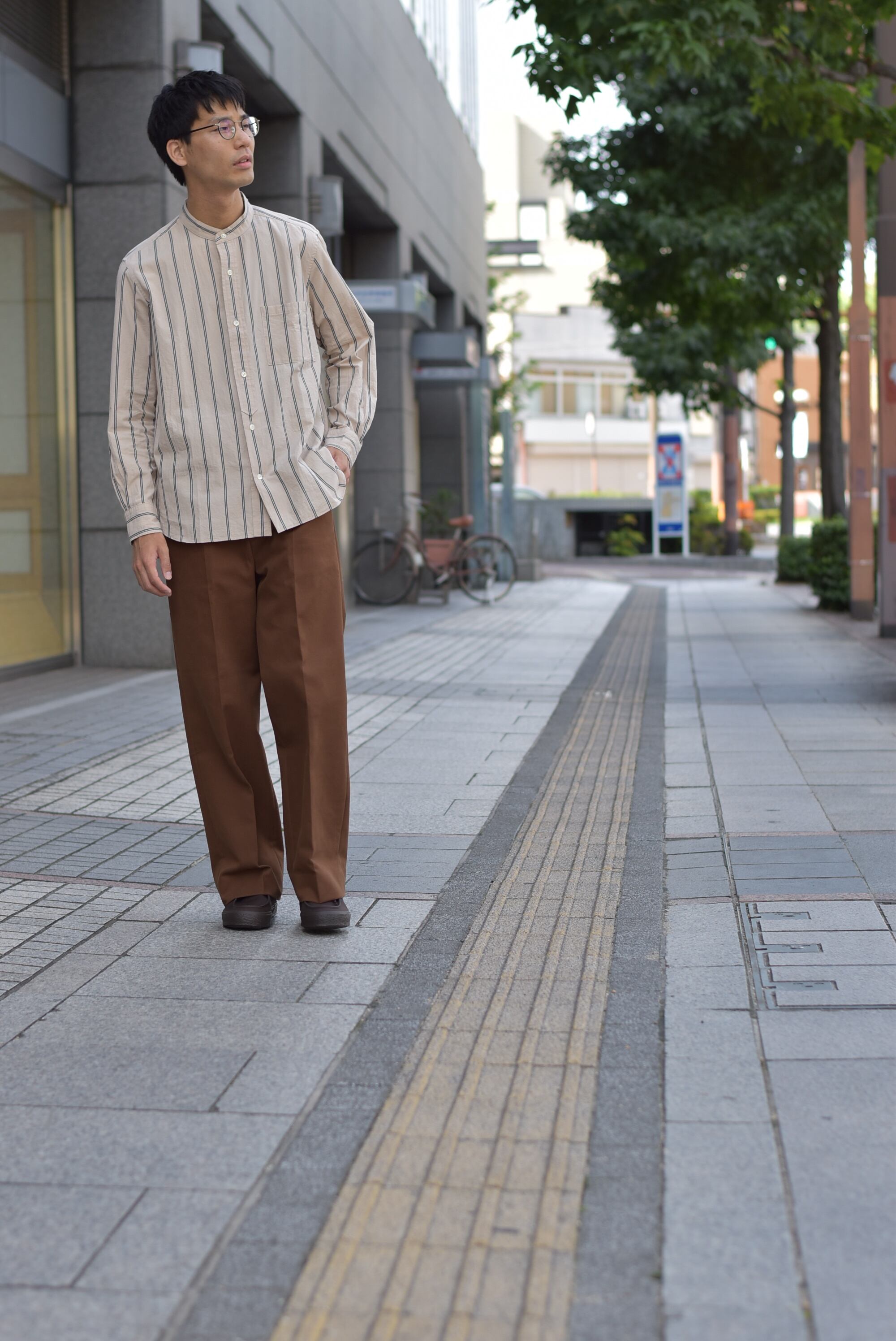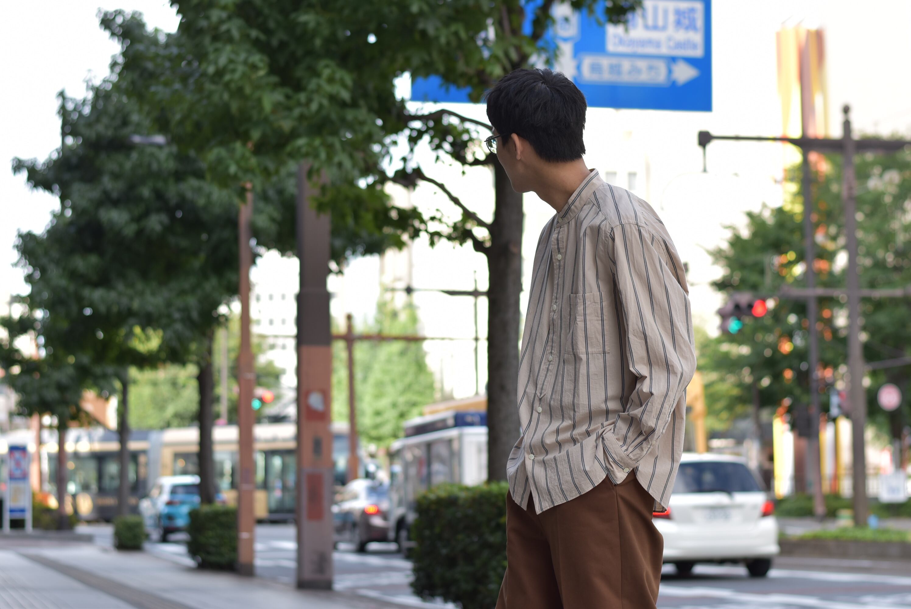 ややゆとりのあるシルエットのスタンドカラーシャツ。