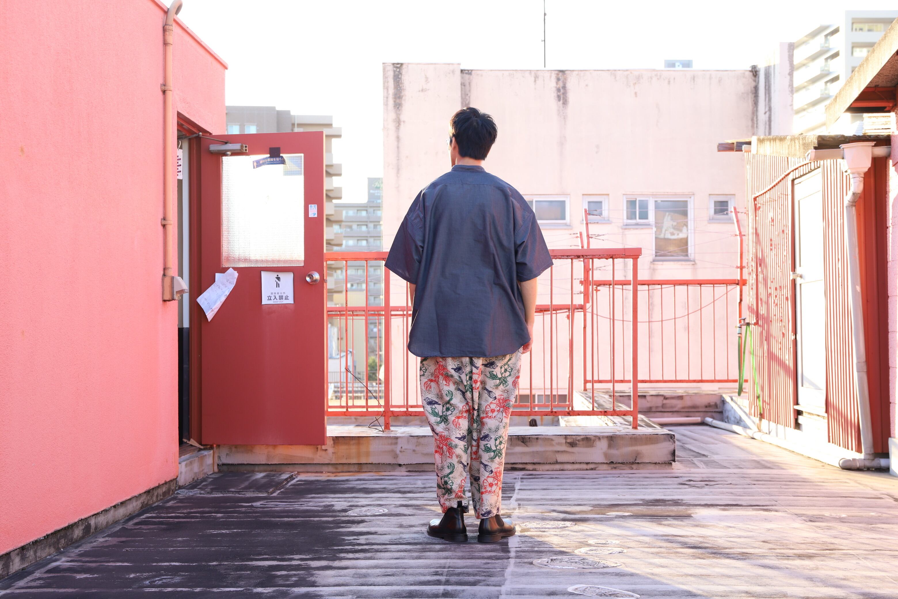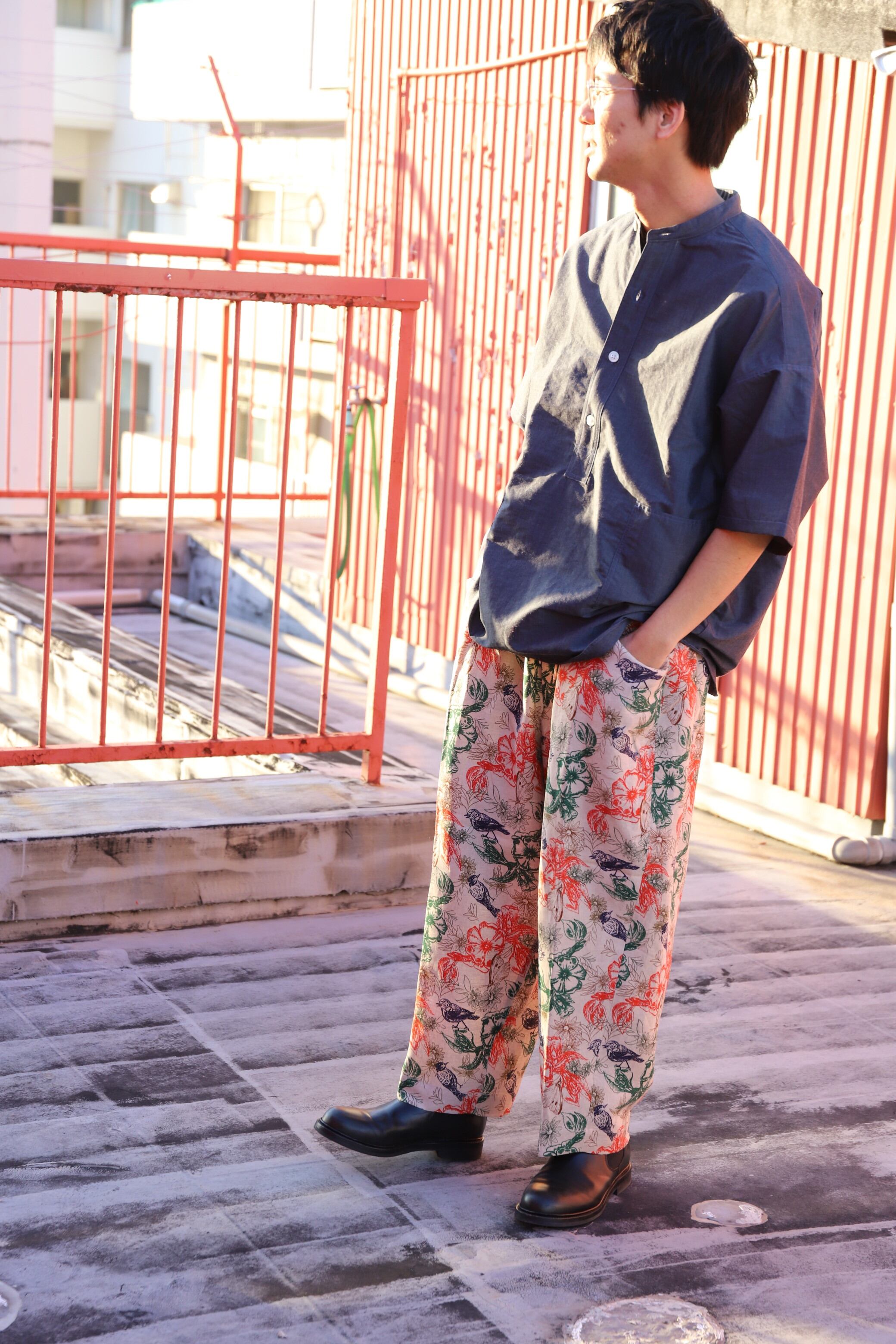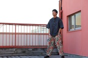 リゾート感のあるボタニカルプリント素材を使用したイージーパンツ。