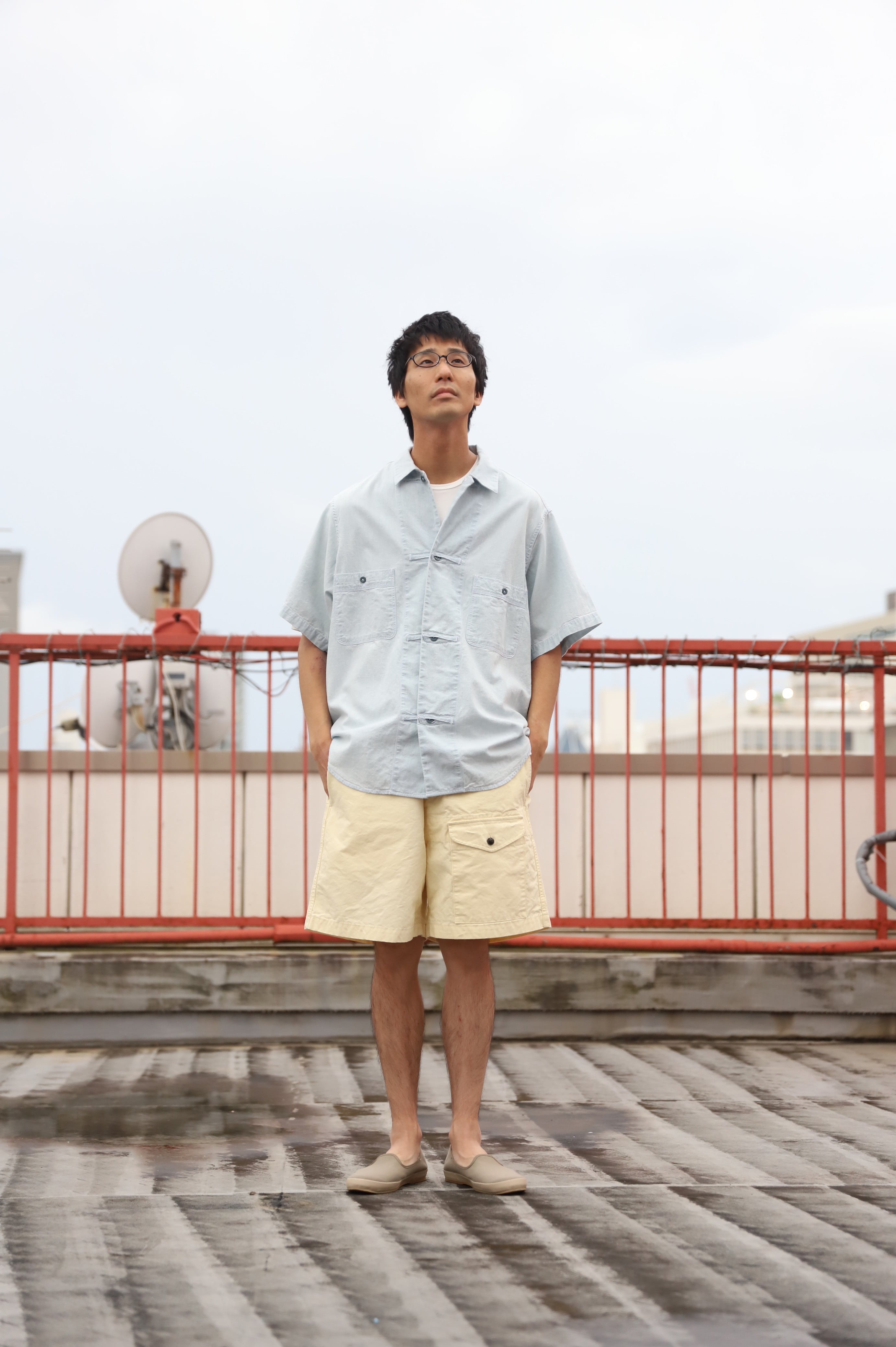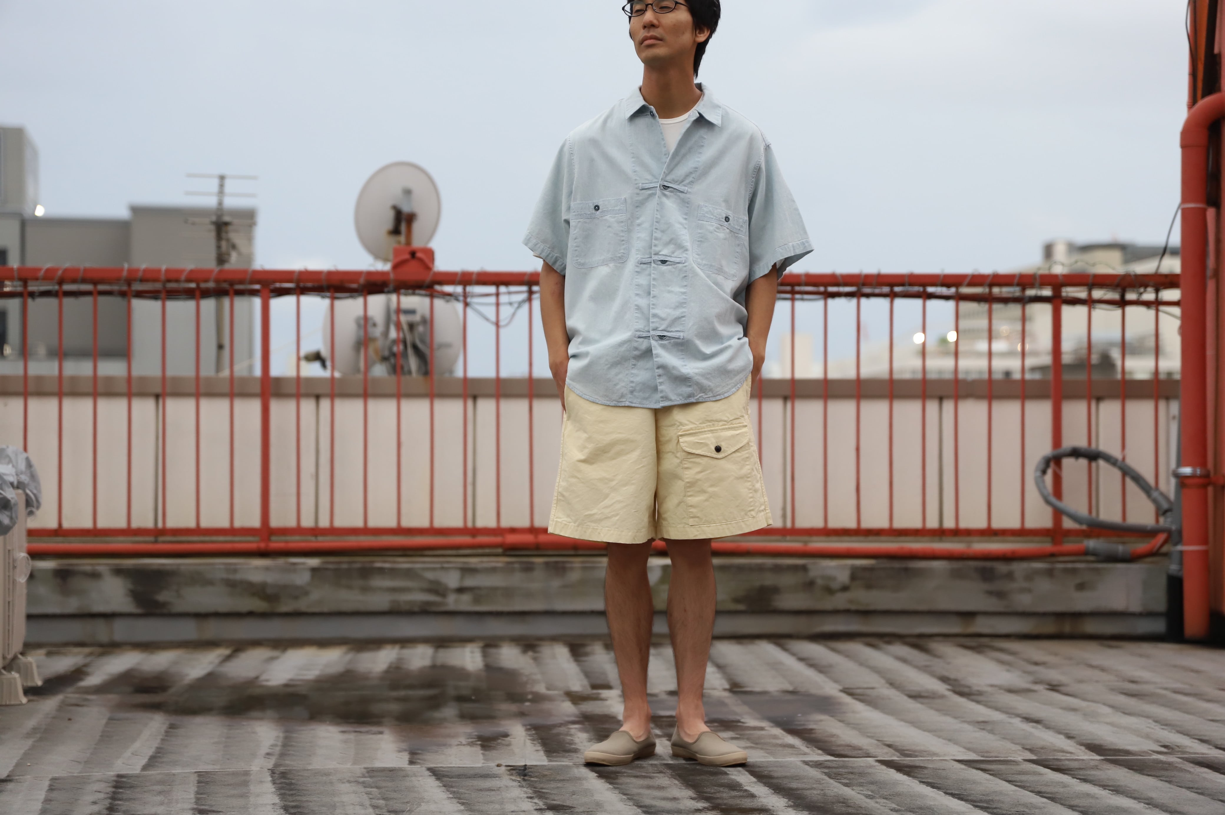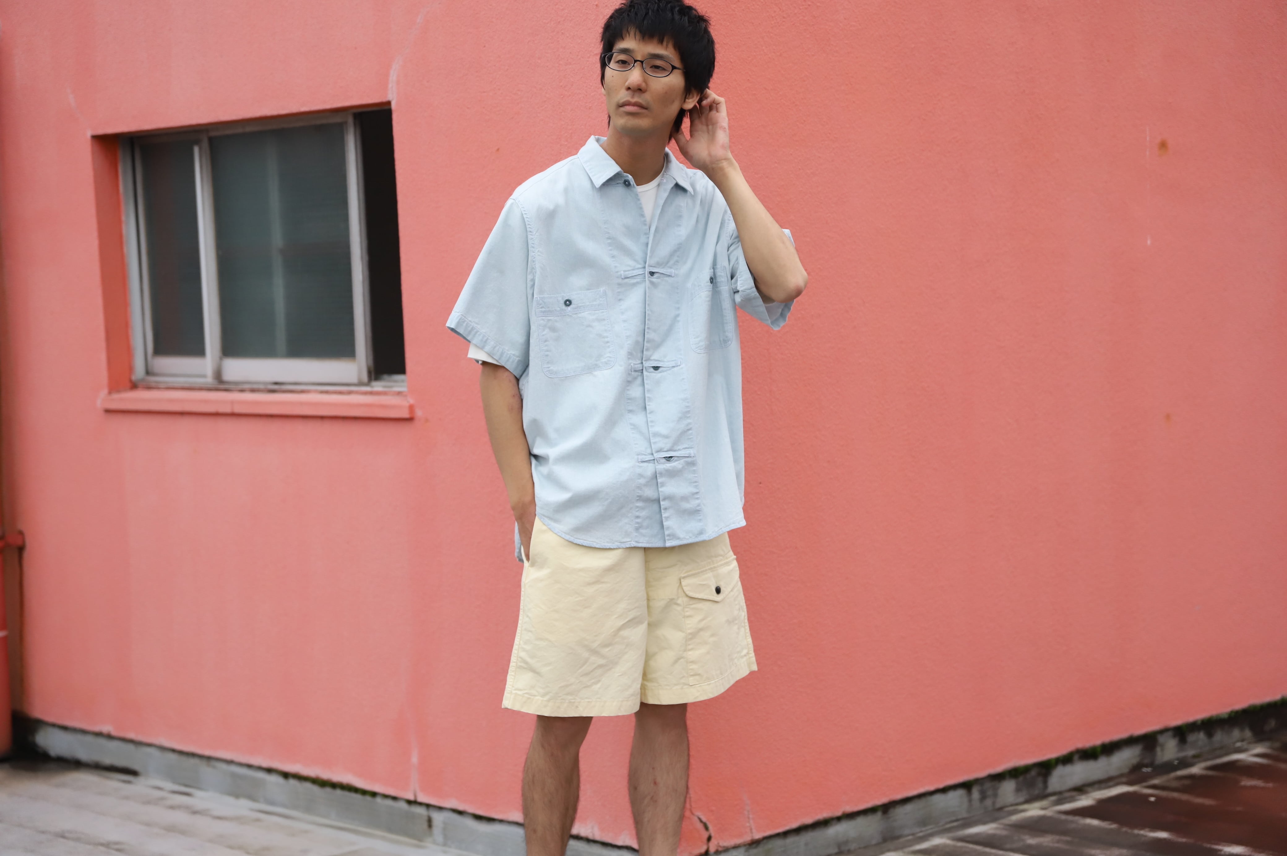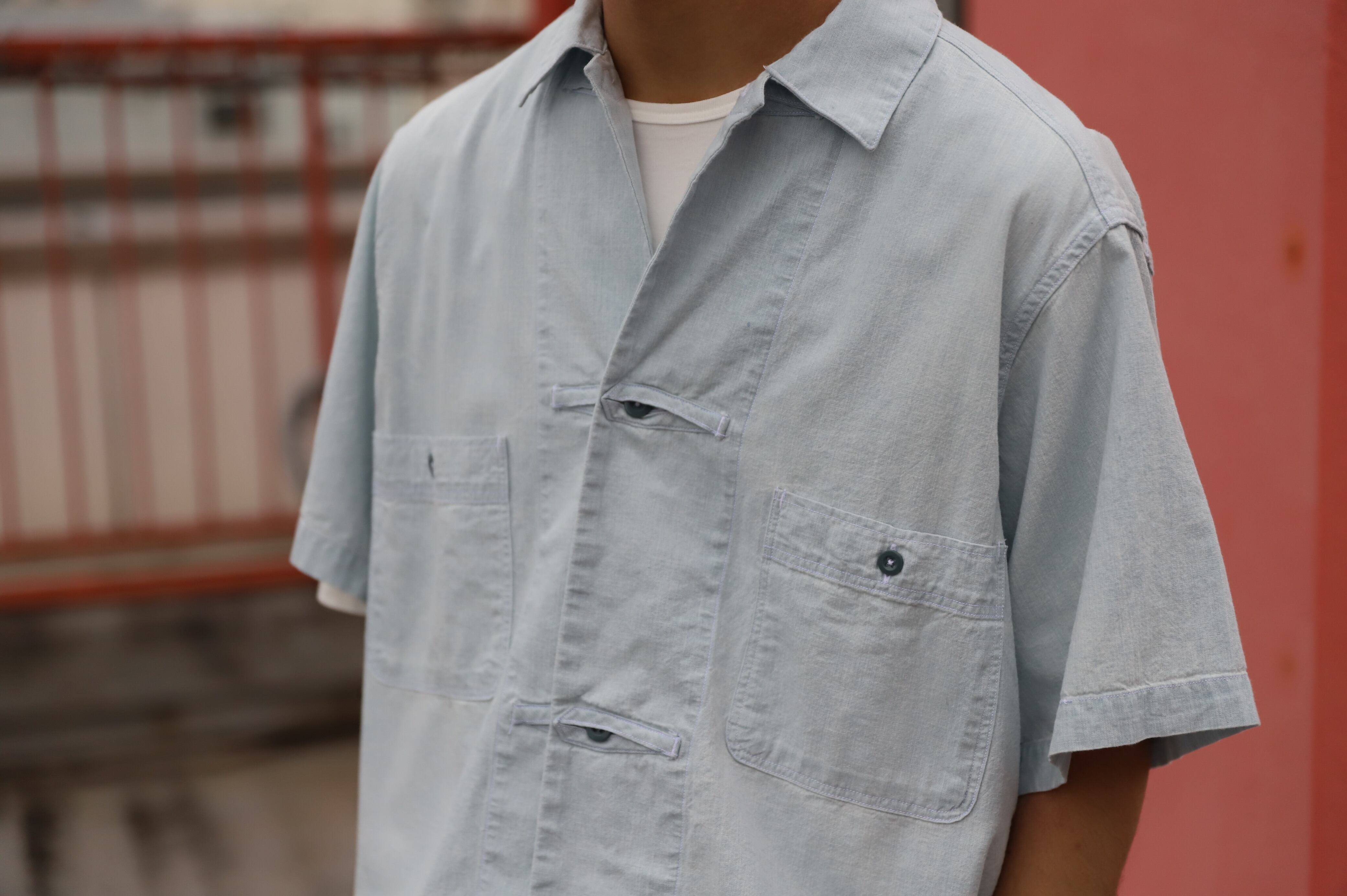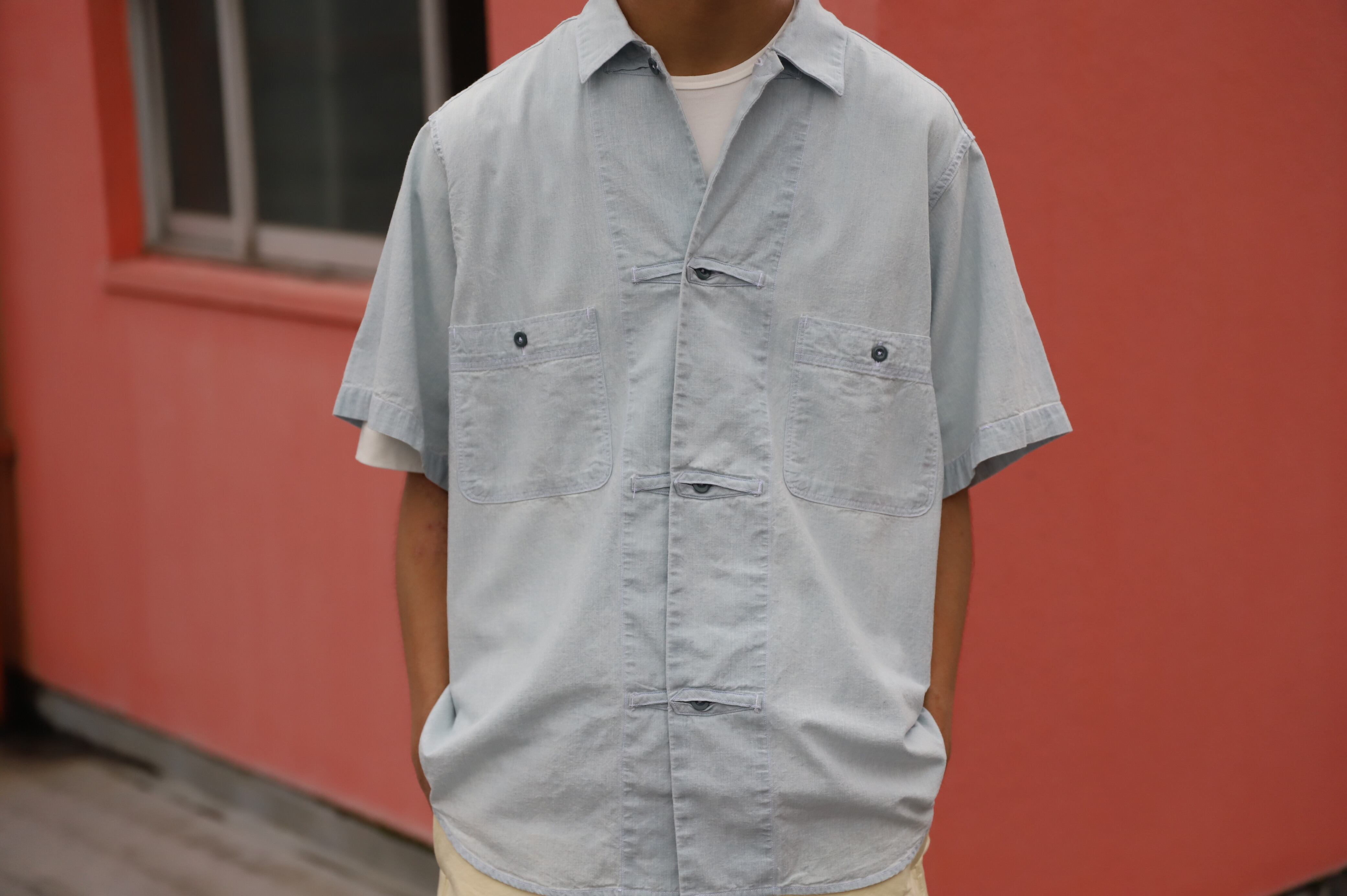 サックスブルーのダンガリー生地によるワークシャツ・・・